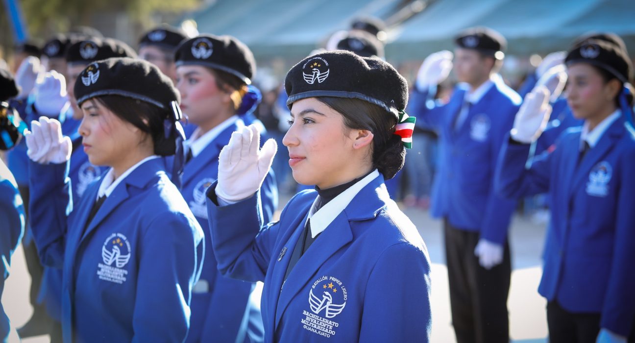 León, Gto.- La presidenta municipal de León, Alejandra Gutiérrez Campos, encabezó la ceremonia de imposición de insignias del Bachillerato Bivalente Militarizado (BBM) plantel León II, donde reconoció la disciplina y formación de las y los estudiantes, además de invitarlos a integrarse en el futuro a las corporaciones de seguridad del municipio.
